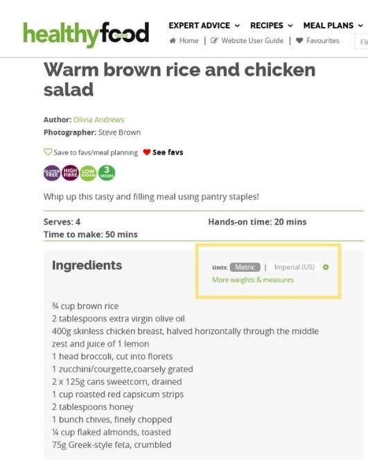 Within the ingredients section of each recipe, the grey highlighted ‘Units’ indicate whether the recipe is shown in metric or imperial. To switch weights and measurement systems, simply click the option you prefer.