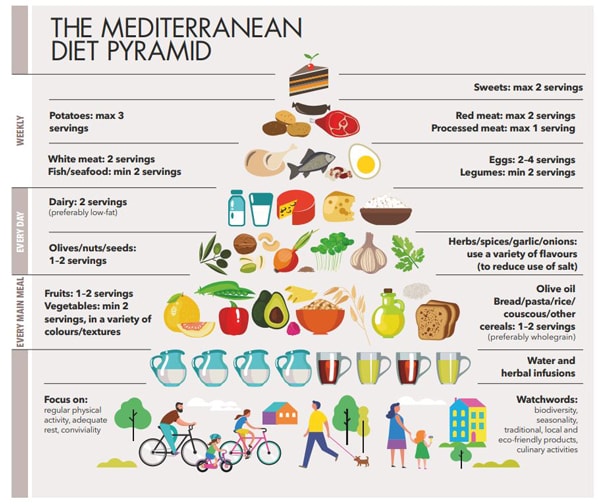 The Mediterranean Diet Foundation (an international organisation based in Greece) advises following the Med diet pyramid, an eating plan supported by the Federation of European Nutrition Societies and the Forum on Mediterranean Food Cultures. This places foods of plant-based origin at the base of the pyramid, which, it advises, should be consumed in greater proportion and frequency than foods at the central and upper levels. The red meat and sugary foods at the top of the pyramid should be eaten least frequently of all.